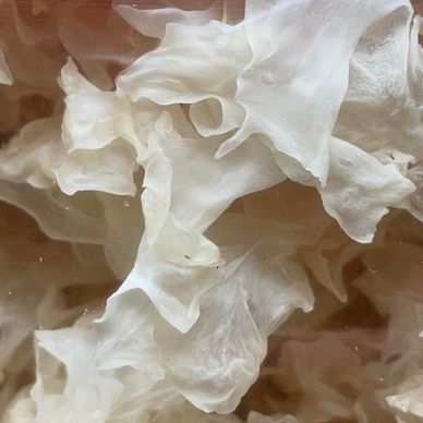White fungus is an edible fungus that is also known as snow fungus, silver ear, snow ear, white wood ear, and white jelly mushroom. White fungus commonly grows in Asia but is also found package and sold dried in Asian Food Market throughout North America. White fungus has a sweet taste and bland texture and is traditionally cooked in soups, both sweet and savory. It has been used as a medicinal herb in Chinese medicine for years to promote health and longevity